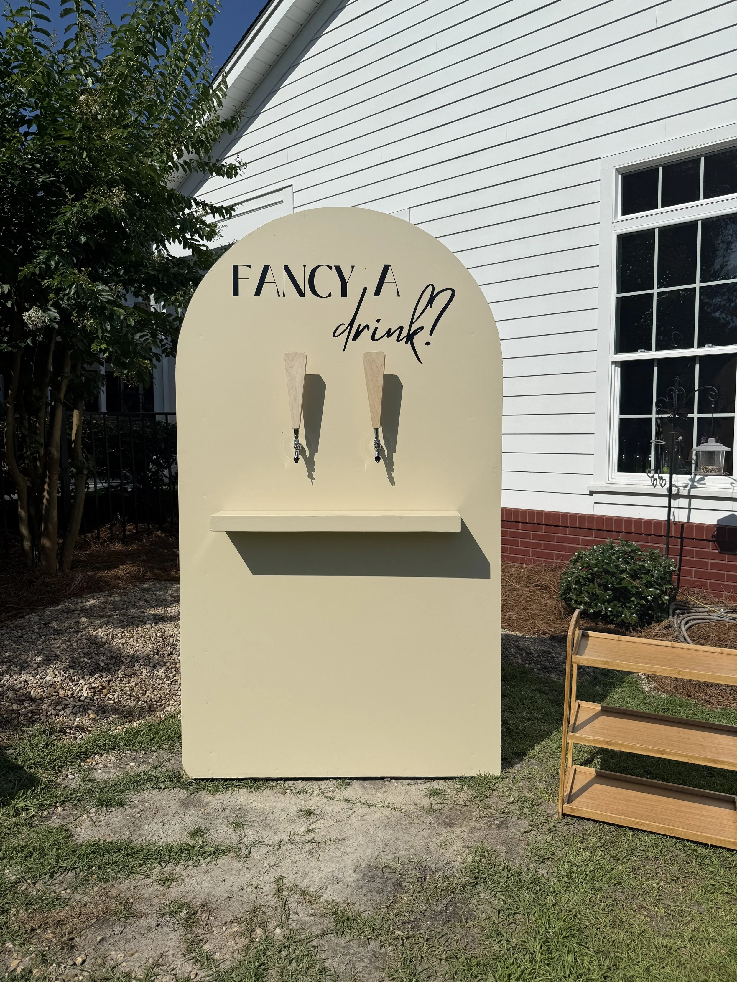 Say hello to our chic sippable party rental, our Tap Wall! This beauty is a stylish, fun way to keep the drinks flowing and the good times rolling at intimate gatherings and events. With two taps, custom bar menus, CO₂/nitrogen hookups (no pumping required!), guests can drink delicious cocktails, all while snapping photos in front of our cheeky “Fancy a Drink?” sign.